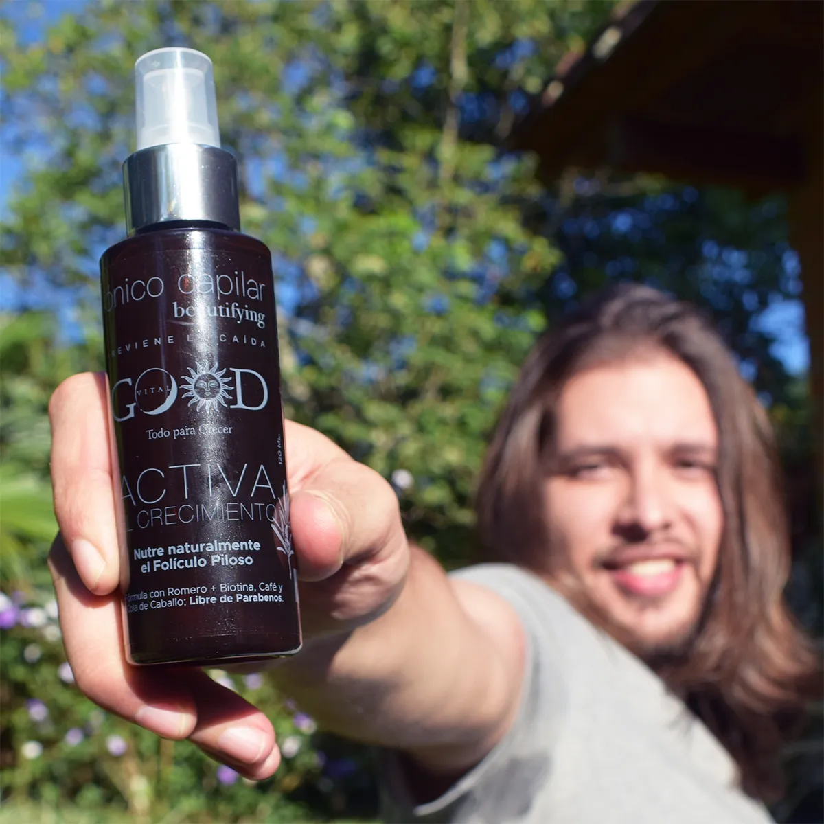 Cola de caballo, Extracto de café, Extracto de Quina, Extracto de Romero, Extracto de Ginseng, D-pantenol, Vitamina E, Libre de parabenos (disminuye alergias e irritaciones). Producto no testado en animales; nutre el folículo piloso de cabello y barba.
